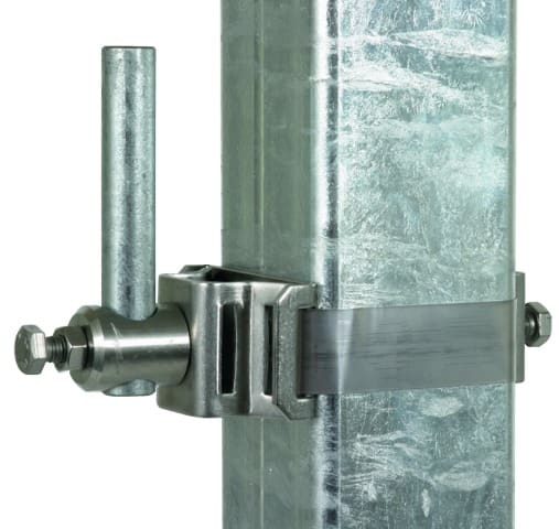 Fascetta di fissaggio per aste di captazione. Per il fissaggio e contemporaneamente il collegamento resistente alla corrente di fulmine dell'asta di captazione, p.es. su supporti metallici di impianti FV (profilo quadrato). Di solito usata su costruzioni in acciaio oppure costruzioni in cemento armato. Si deve montare ogni asta di captazione con due fascette di fissaggio. Con l'applicazione di due fascette di fissaggio viene garantita la tenuta meccanica e la portata di corrente di fulmine pari a 100 kA (10/350 µs). In caso di montaggio su tubi si deve smontare la piastra di pressione (piastra piatta angolata 2 volte).