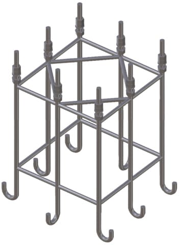 Gabbia di ancoraggio con perno filettato da cementare, adatta per flangia dei pali componibili di captazione. Esecuzione piccola per pali con un’altezza sopra terra da 22,35 fino a 24,85.