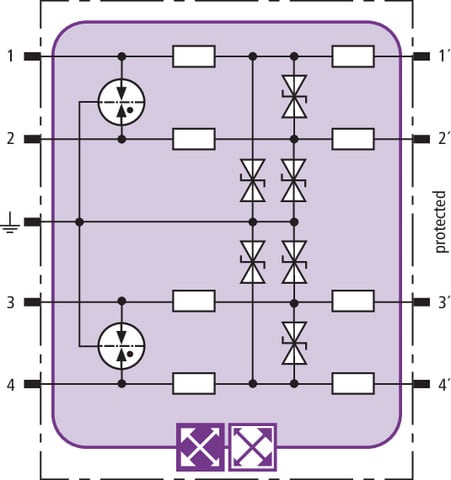 Modulo di protezione combinato con LifeCheck, esecuzione stretta, per la protezione di 2 coppie di fili a interfaccia simmetrica con circuito di protezione d’ingresso a diodi, loop di corrente (TTY) ed ingressi opto-accoppiatori. LifeCheck riconosce sovraccarichi termici ed elettrici che richiedono la sostituzione dello scaricatore. La segnalazione avviene senza contatto tramite DEHNrecord LC / SCM / MCM.