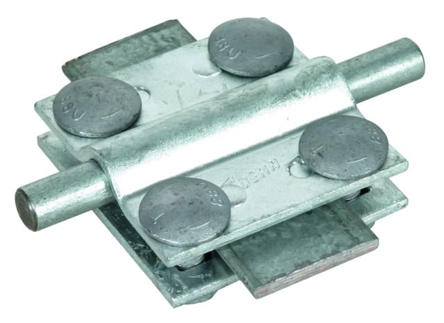 Morsetto a croce secondo CEI EN 62561-1 per collegamento fuori e sotto terra di conduttori tondi e piatti. Esecuzione con piastra intermedia e viti M8.