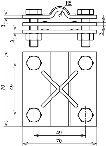 DEHN - Morsetto a croce in rame per tubi da 8-10 mm e piastre da 30-40 mm con piastra intermedia.