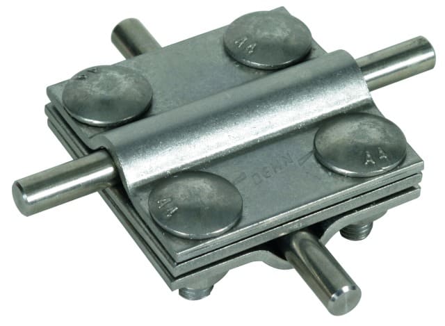 Morsetto a croce secondo CEI EN 62561-1 per collegamento fuori e sotto terra di conduttori tondi e piatti. Esecuzione con piastra intermedia e viti M8.