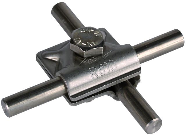 Morsetto di collegamento multiuso a norma DIN EN 62561-1, per l’utilizzo universale come morsetto a croce, a T e parallelo per conduttori a sezione tonda. Versione in due parti con bullone a testa esagonale e filettatura nella parte inferiore.