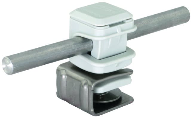 Staffa portafilo per tetti PLATTENsnap per il fissaggio di captatori e calate per coperture. Esecuzione con morsetto per il fissaggio su costruzioni sovrapponibili, con staffa portafilo DEHNsnap, posa libera del conduttore, in materiale plastico resistente alle intemperie, stabilizzato ai raggi UV e privo di alogeni.