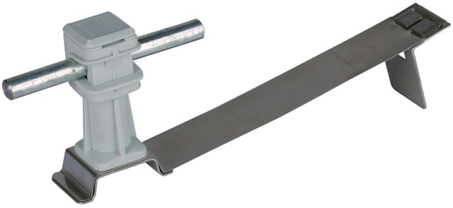 Staffa portafilo per tetti FLEXIsnap con montante di supporto flessibile angolato per il fissaggio di captatori e calate per tetti piani. Esecuzione con montante di supporto flessibile in acciaio INOX sottile (0,3 mm), per l'adattamento alla scanalatura delle tegole / pietre, con staffa portafilo DEHNsnap altezza 16 mm, posa libera del conduttore, in materiale plastico resistente alle intemperie, stabilizzato ai raggi UV e privo di alogeni.