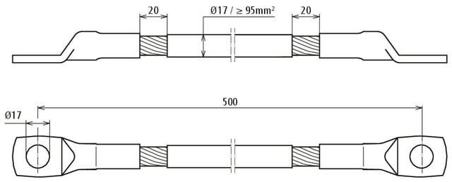 Connettore di messa a terra con cavo d’acciaio conforme alla direttiva delle ferrovie tedesche Ril 997.0205A01, per la messa a terra, per i circuiti di corrente di ritorno e per l’equipotenzialità nel campo delle linee ferroviarie. Costituito da due capicorda con foro da 17 mm. Questa struttura in cavo d’acciaio costituisce una misura antifurto preventiva. Progettato per correnti di cortocircuito ≤ 25 kA.