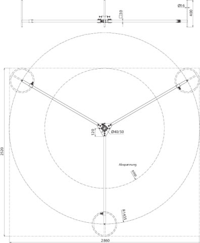 Tripode per la realizzazione indipendente di tubi portanti DEHNiso-Combi (D50 lunghezza 3200 mm). Per la realizzazione con zoccoli in cemento con cuneo, senza fissaggio supplementare agli elementi della costruzione. Con adattamento all'inclinazione del tetto fino a max. 10°. Esecuzione pieghevole, speciale per la conduttura HVI posta all'interno del tubo portante. Per mantenere il raggio di piegatura della conduttura HVI nella zona inferiore sul treppiede, vengono posizionati due zoccoli in cemento al di sotto della struttura e uno al di sopra.