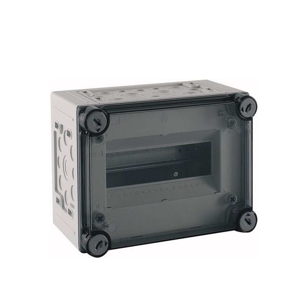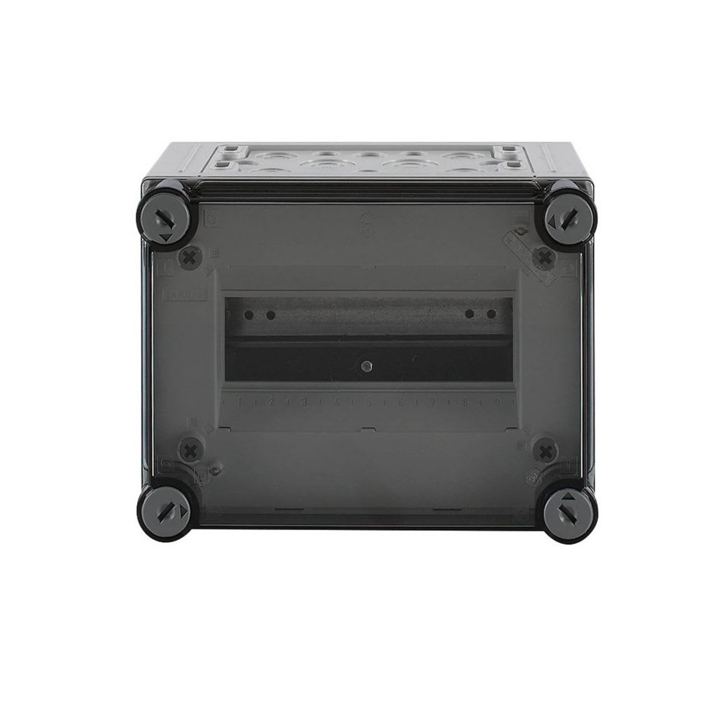 Custodia singola apparecchiature automatiche, materiale policarbonato, resistente agli urti, grado di protezione IP65, setti sfondabili metrici in tutte le pareti laterali, apparecchi da incasso grandezza costruttiva 1 secondo DIN 43880, coperchio trasparente con chiusure a maniglia, antina trasparente per l'utilizzo degli apparecchi ad incasso, guide DIN per il montaggio a scatto degli apparecchi, strisce di copertura per spazi di incasso non utilizzati, copertura di protezione contro contatti accidentali con strisce per diciture, sbarre PE/N incluse, fascette per il fissaggio a parete, chiusura coperchio piombabile, numero unità passo=9, morsetti PE e N numeroxsezione=ciascuno 2x(6-16)mm² e 7x(1-4)mm², versione coperchio: trasparente, versione porta: senza
