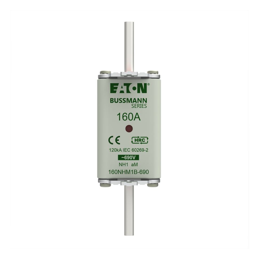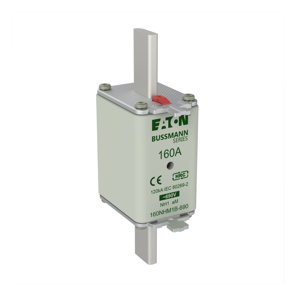 EATON INDUSTRIES - Cartuccia fusibile 160A, bassa tensione, 690VAC, NH1, AM, IEC, indicatore doppio, linguette di impugnatura. Parte inferiore tensione. 160NHM1B-690