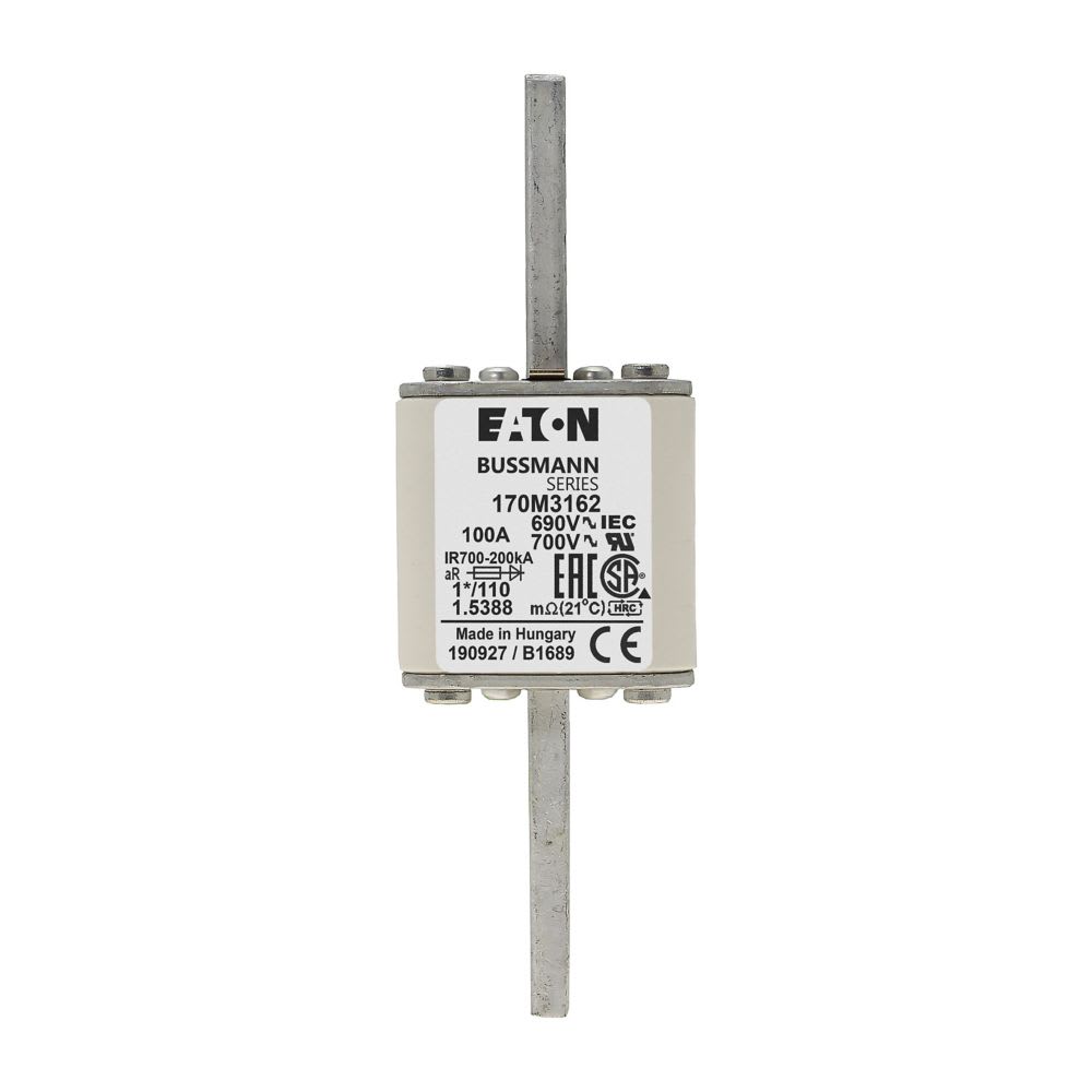 EATON INDUSTRIES - Cartuccia fusibile 170M3162, corsa rapida 100A 690V, dimensioni compatte 45x134mm, aR, DIN, IEC, indicatore singolo, 1*/110 AR UC. 170M3162