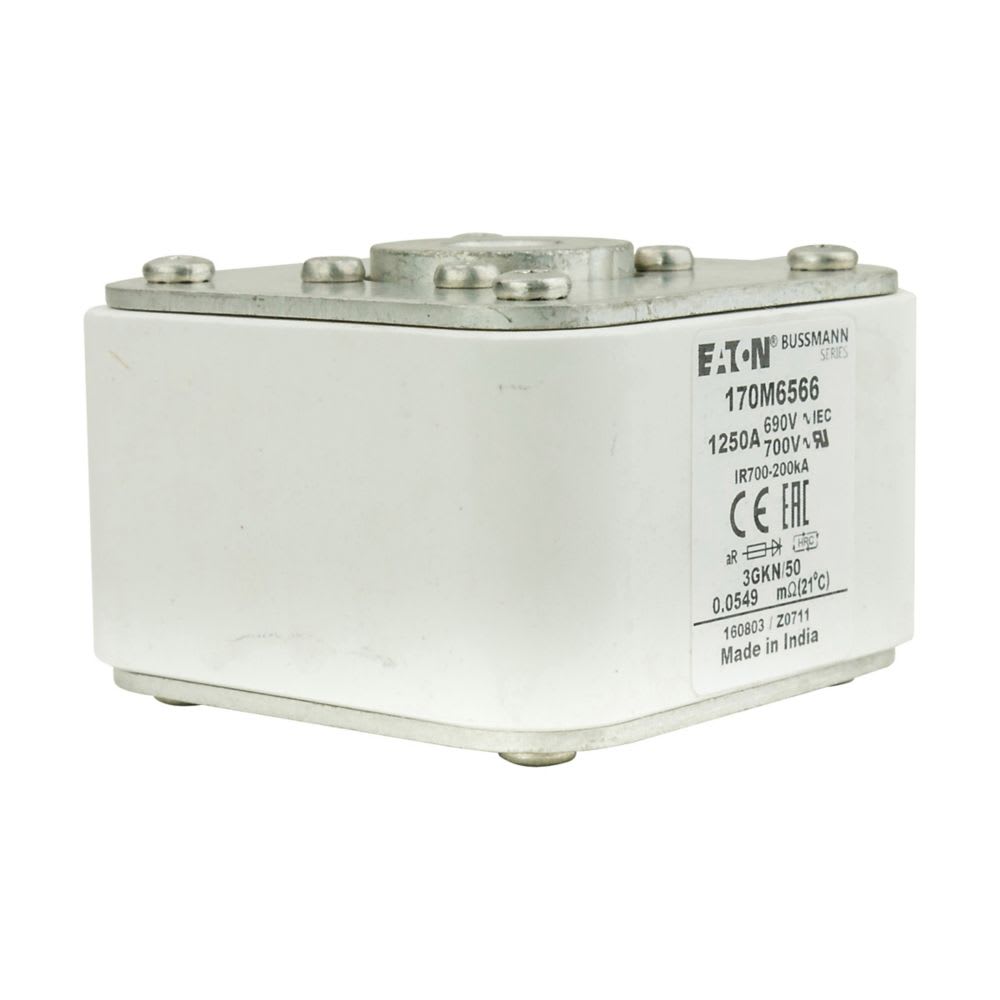 EATON INDUSTRIES - Cartuccia fusibile 170M6566, corsa rapida, 1250A, 690V, 3GKN/50, dimensioni 3,76x92x53mm, aR, IEC, UL, indicatore singolo, UC. 170M6566