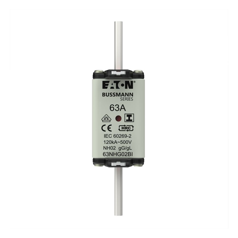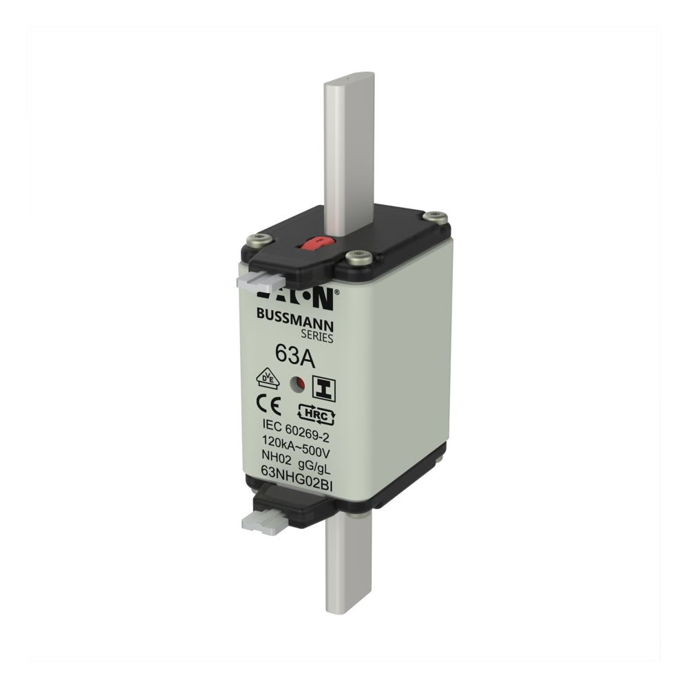 EATON INDUSTRIES - Cartuccia fusibile 63A, bassa tensione, AC 500V, NH02, GG-GL, IEC, indicatore doppio, linguette impugnatura isolate. 63NHG02BI