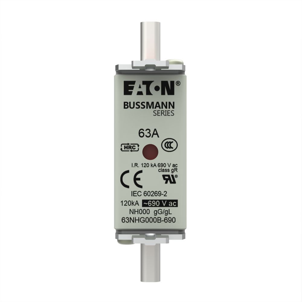 EATON INDUSTRIES - Cartuccia fusibile bassa tensione 63A AC 690V NH000 gL/gG IEC indicatore doppio linguette impugnatura parte inferiore. 63NHG000B-690