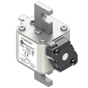 Fusibile, cartuccia fusibile, extra-rapido, 350 A, AC 690 V, size 1, 53 x 69 x 111 mm, aR, IEC, indicatore singolo, corpo quadrato con terminali di collegamento centrai (scanalai), modello francese, indicatore stile K per microinterruttore, protezione semiconduttori, IEC 60269-4, potere di apertura 200 kA