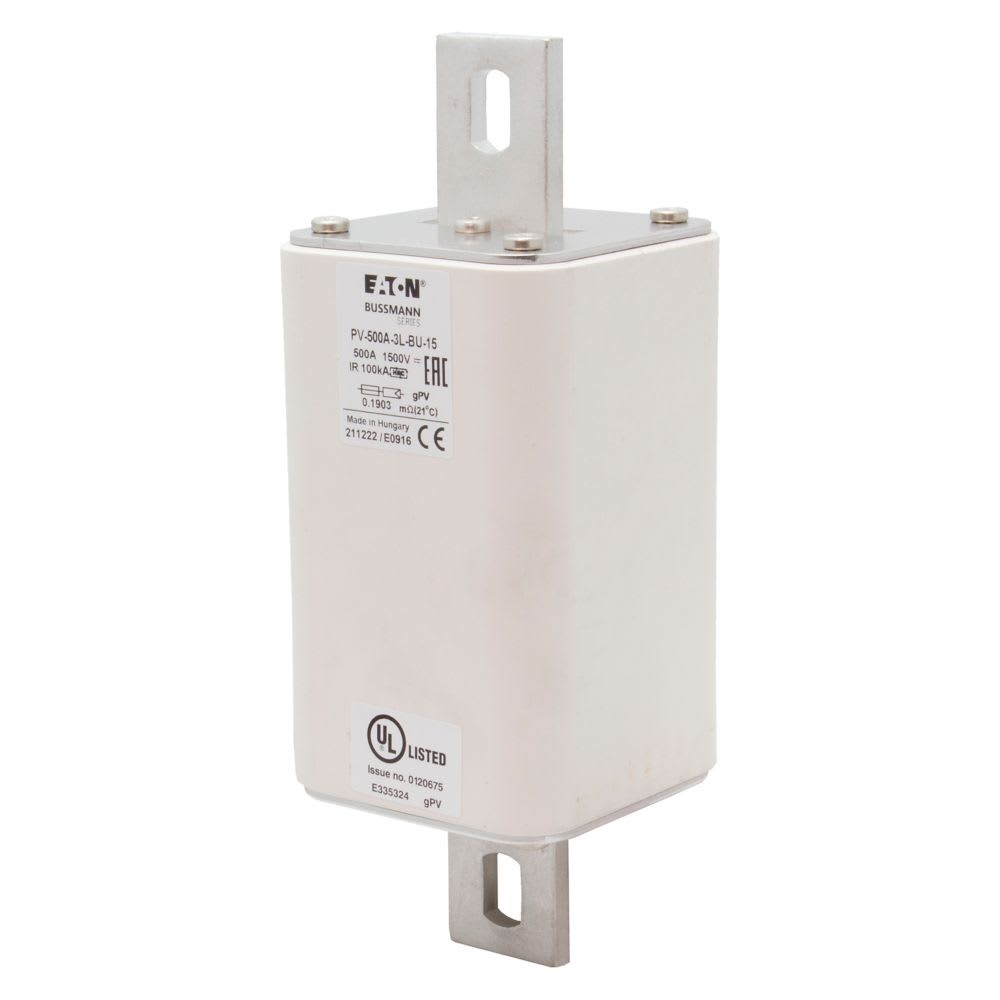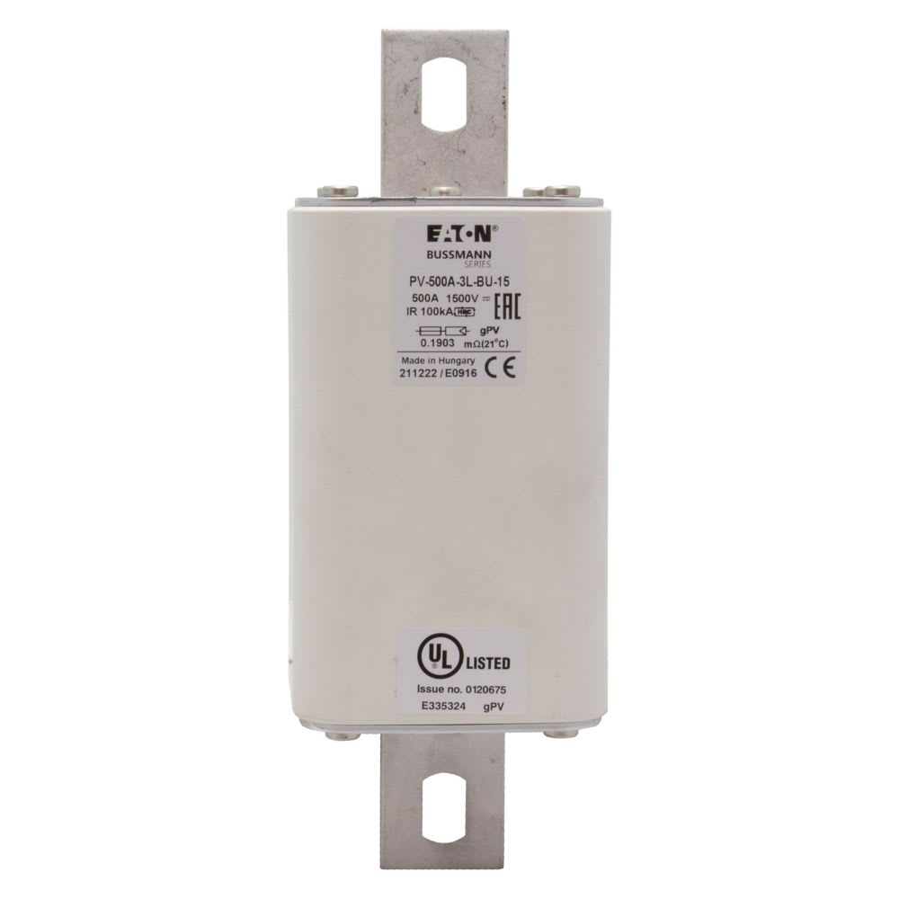 EATON INDUSTRIES - Cartuccia fusibile extra-rapido 500A 1500V 3L 75x91x201mm gPV UL IEC senza indicatore contatti con fissaggio a bullone PV-500A-3L-BU-15 FUSE 500A 1500V B-IN NO