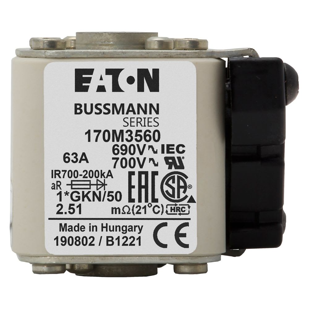 EATON INDUSTRIES - Cartuccia fusibile extra-rapido 63A 690V dimensioni compatte 1,45x59x51mm aR IEC UL indicatore singolo 170M3560 FUSE 63A 690V 1*GKN/50 AR UC.