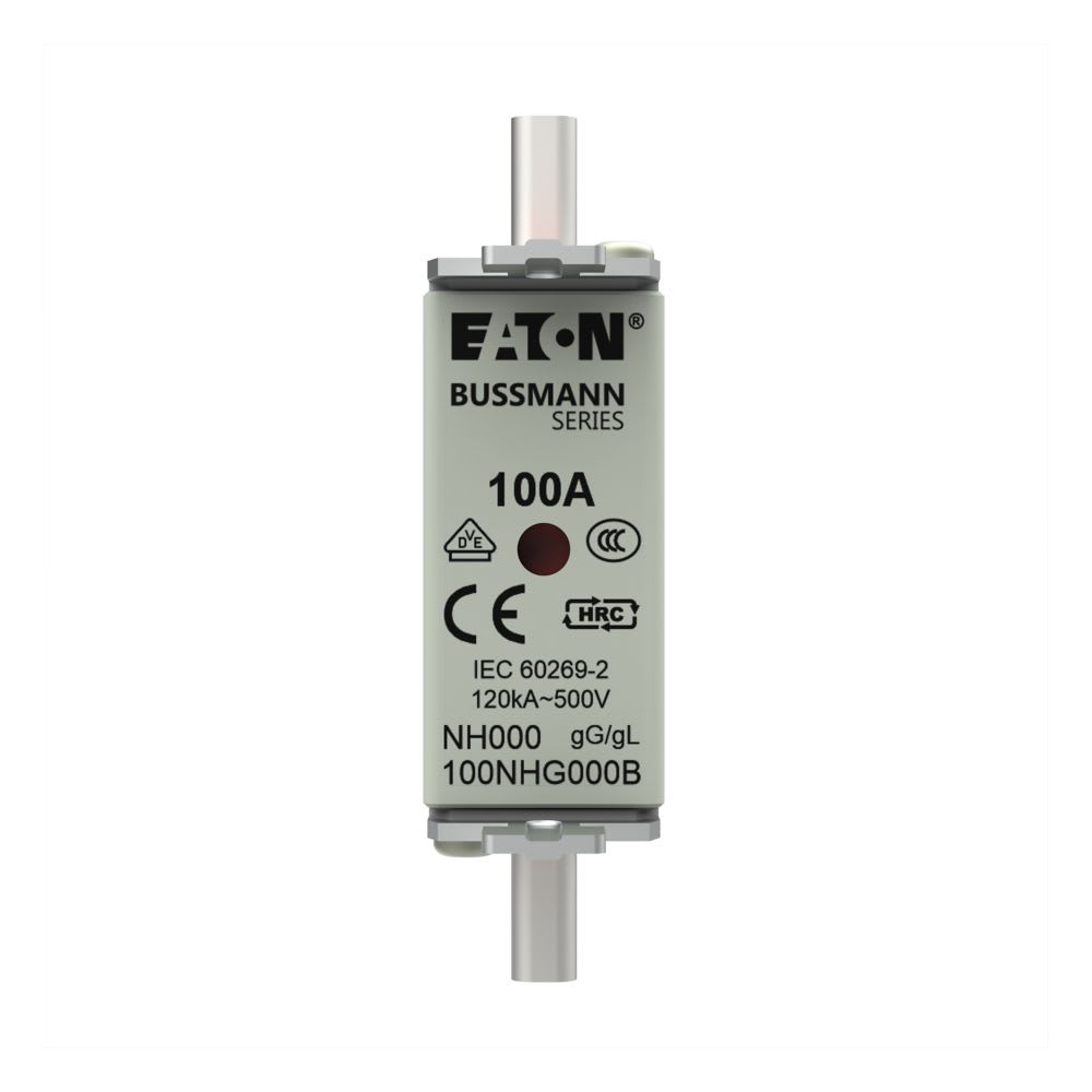 EATON INDUSTRIES - Cartuccia fusibile NH000, 100A, 500VAC, GG-GL, AC, IEC, indicatore doppio, linguette impugnatura sotto tensione. 100NHG000B