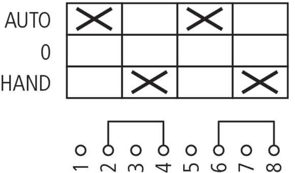 Interruttore di commutazione, Gamma di prodotti: Commutatori di controllo, Conformità alle norme: IEC/EN 60947, VDE 0660, IEC/EN 60204, CSA, UL, Sezionatori di potenza secondo IEC/EN 60947-3, Rilevatore tipo: T0, con leva nera e piastra frontale, Contatti: 4, Grado di protezione: IP30 frontale, Design: fissaggio su quadro di installazione e distribuzione, Angolo di commutazione: 45 °, Caratteristica di commutazione: permanente, con posizione 0, 2 Unità costruttiva/e, Corrente nominale ininterrotta: Iu= 20 A, piastra frontale: HAND-0-AUTO