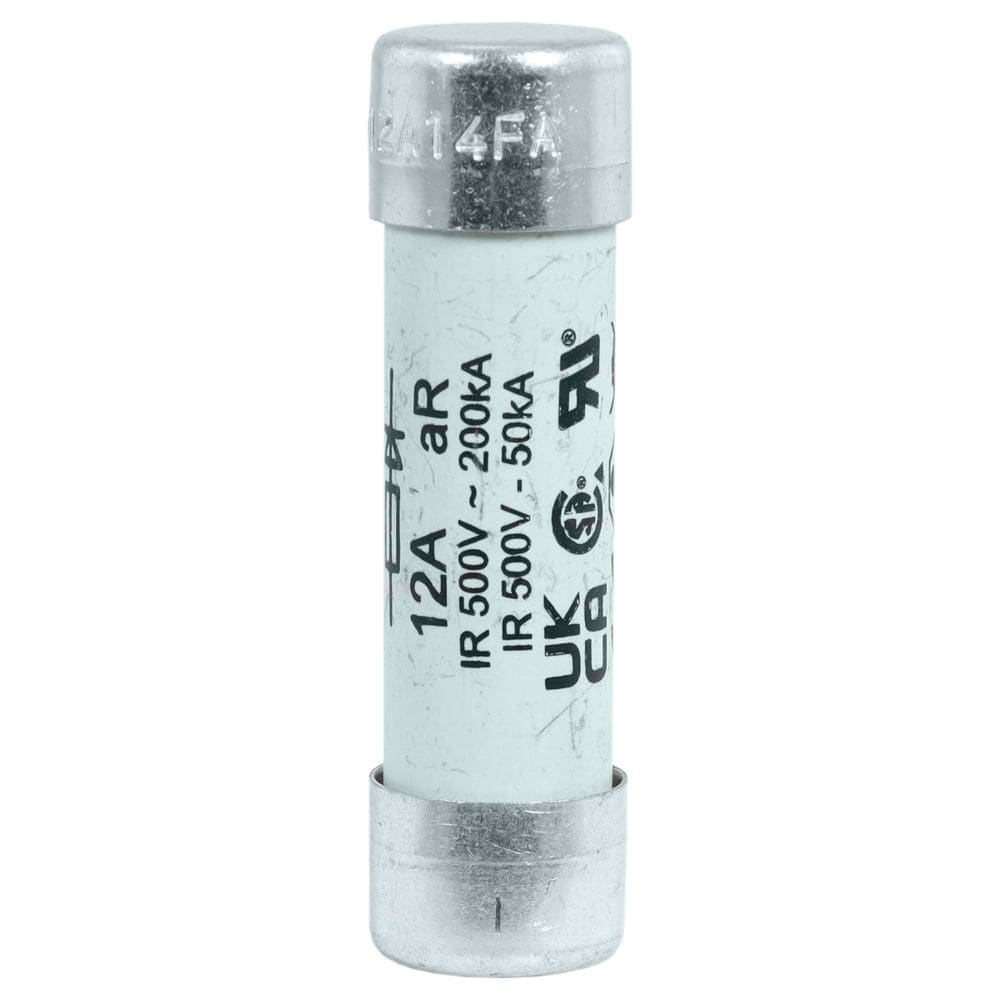 fusibile, cartuccia fusibile, corsa rapida, 12 A, AC 500 V, 14 x 51 mm, aR, UL, cilindrico, protezione di sbarre collettrici DC, motori DC, convertitori/raddrizzatori di potenza e dispositivi di avviamento a bassa tensione, UL 248, potere di apertura 50 kA