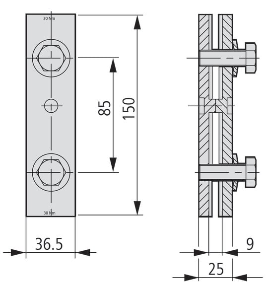 Collegamento longitudinale al sistema a sbarre, 630A, 20-30x5/10, L=150mm, per sistemi a sbarre SASY60i