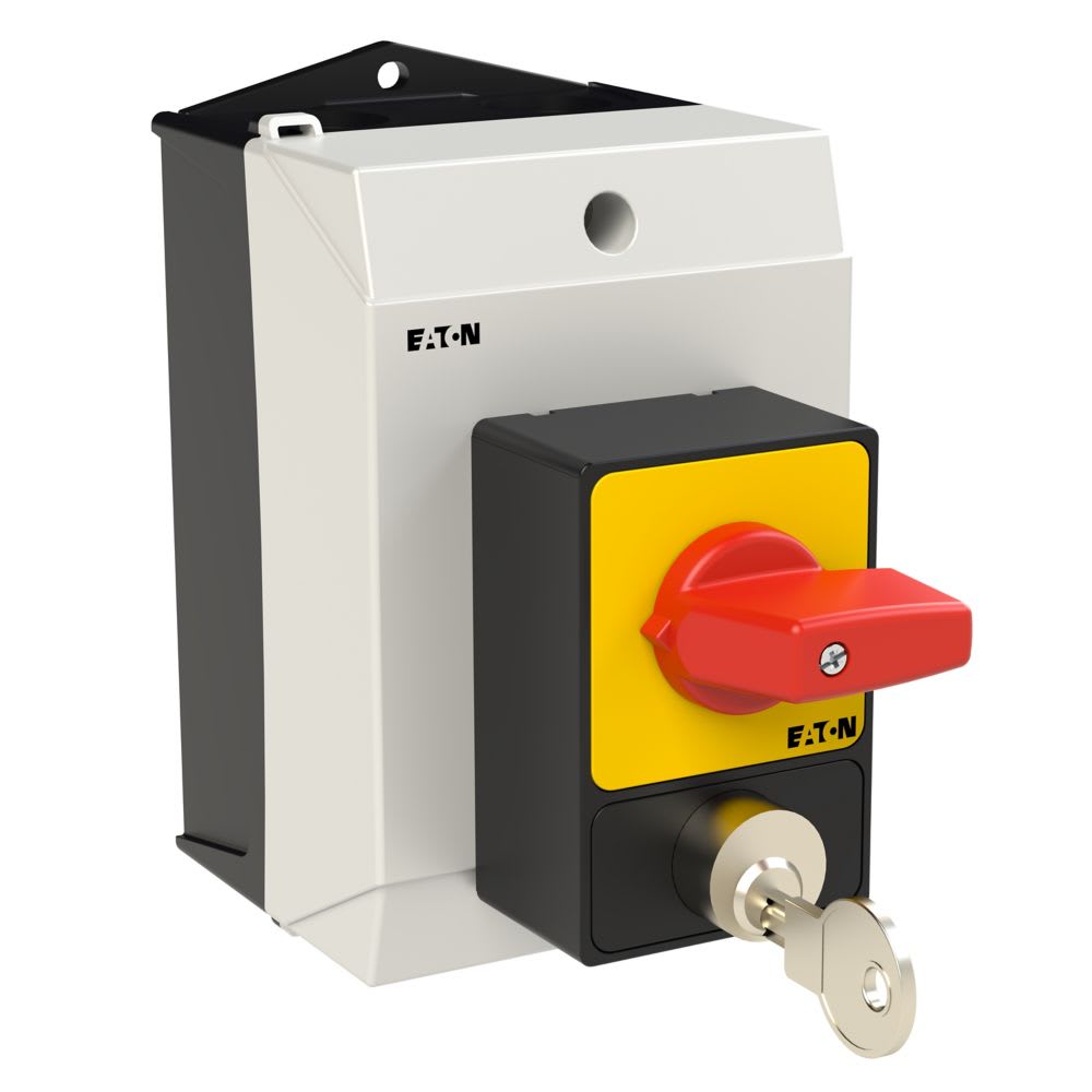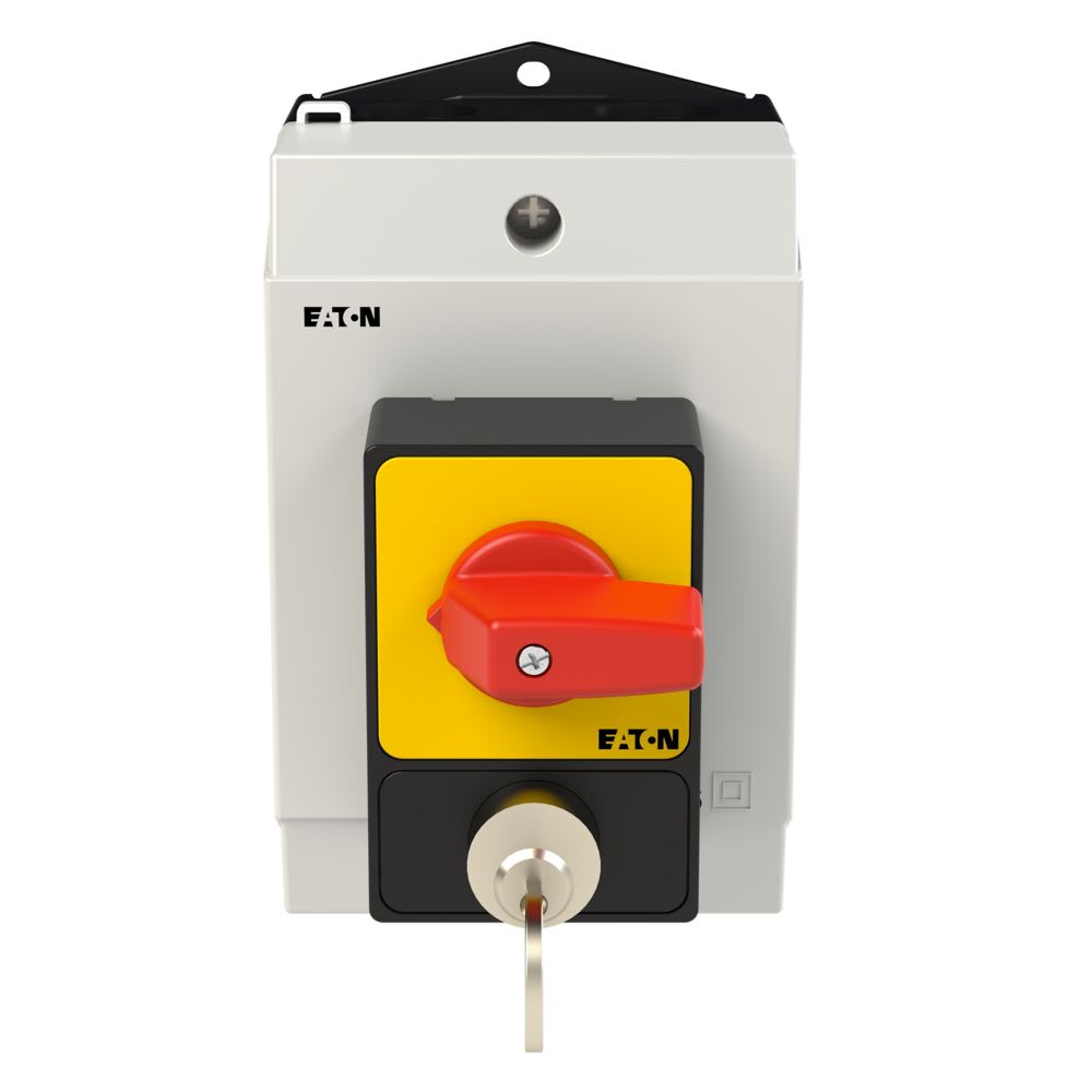 EATON INDUSTRIES - Interruttore antipanico T0-2-1, 20A, custodia, 3 poli, leva rossa, targhetta frontale gialla, blocco con serratura a cilindro SVA.