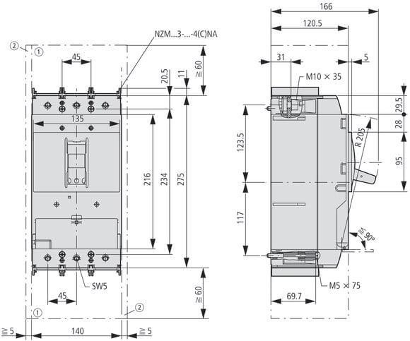 Interruttore automatico NZM3, 3 poli, Poteri d'interruzione 400/415 V 50 Hz( Icu ): 50 kA, Corrente nominale = corrente nominale ininterrotta corrente nominale = corrente nominale ininterrotta ( In = Iu ): 250 A, Tipo di installazione: Estraibile, Collegamento a vite, Standard/Approvazione: IEC, Funzione di protezione: Protezione impianto, cavo, selettiva e generatore