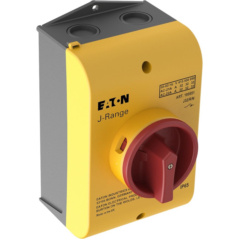 EATON INDUSTRIES - Interruttore generale, 32A, in custodia, 3 poli + N, Funzione di arresto d'emergenza, maniglia rotativa rossa e anello di blocco giallo.