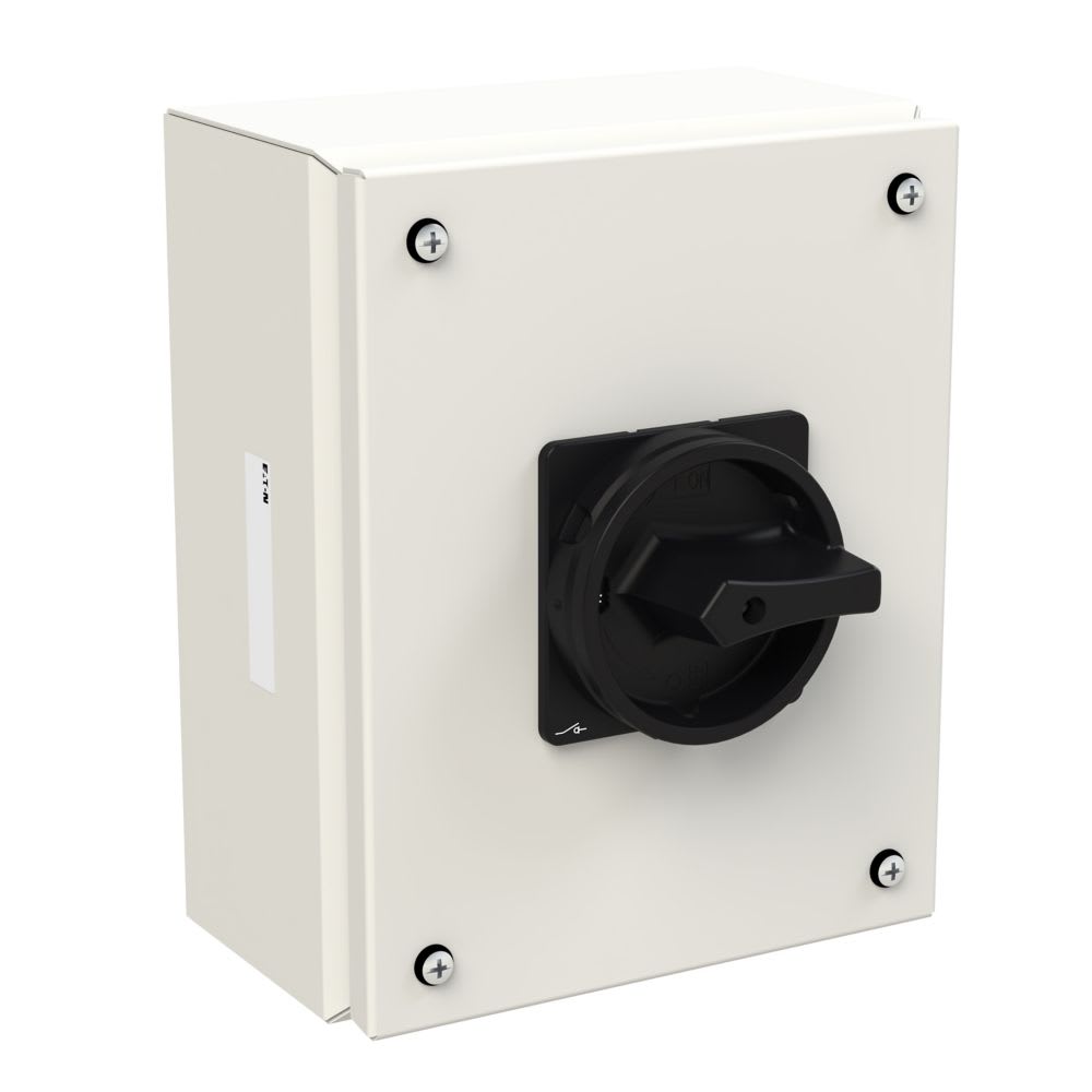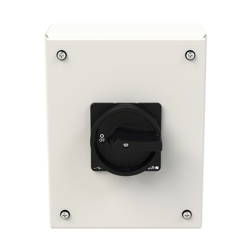 EATON INDUSTRIES - Interruttore generale P3 63 A in custodia 3 poli 1 NA 1 NC Funzione di arresto con maniglia rotativa nera e corona di blocco lucchettabile.