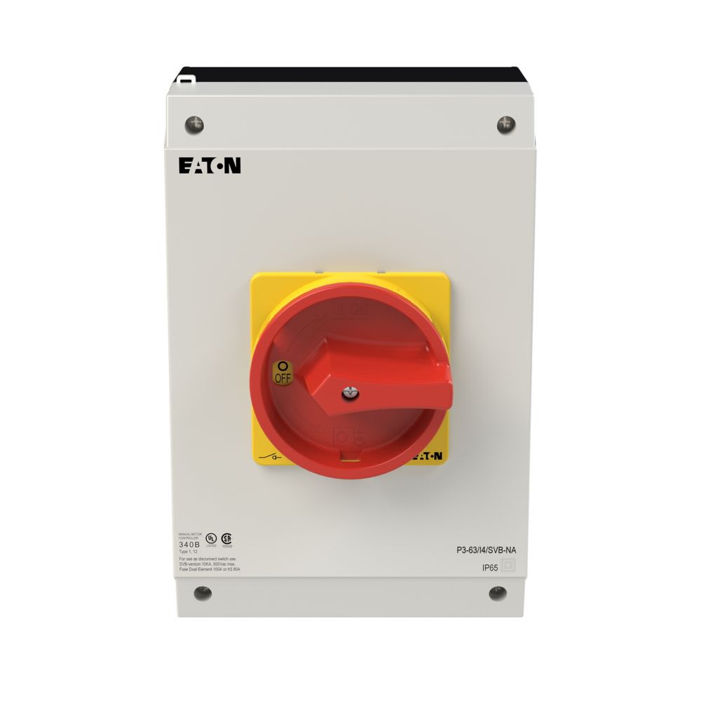 EATON INDUSTRIES - Interruttore generale P3 63A in custodia 3 poli con funzione di arresto d'emergenza maniglia rotativa rossa e anello di blocco giallo UL/CSA.