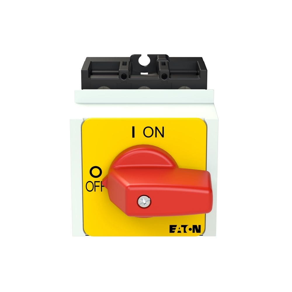 EATON INDUSTRIES - Interruttore ON/OFF, P1, 25 A, Da incasso in sistemi di distribuzione modulare, 3 poli, Funzione di arresto d'emergenza, con leva rossa e targhetta fr.