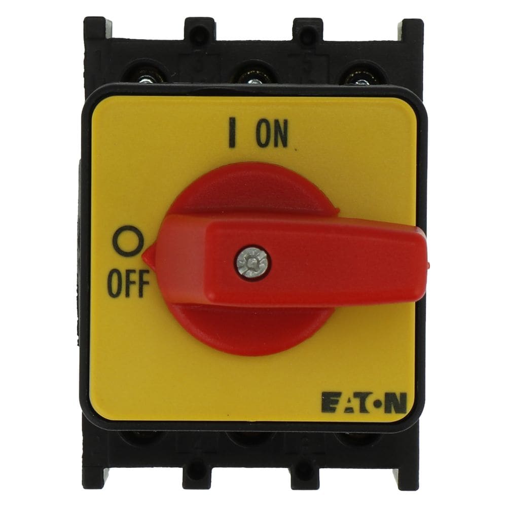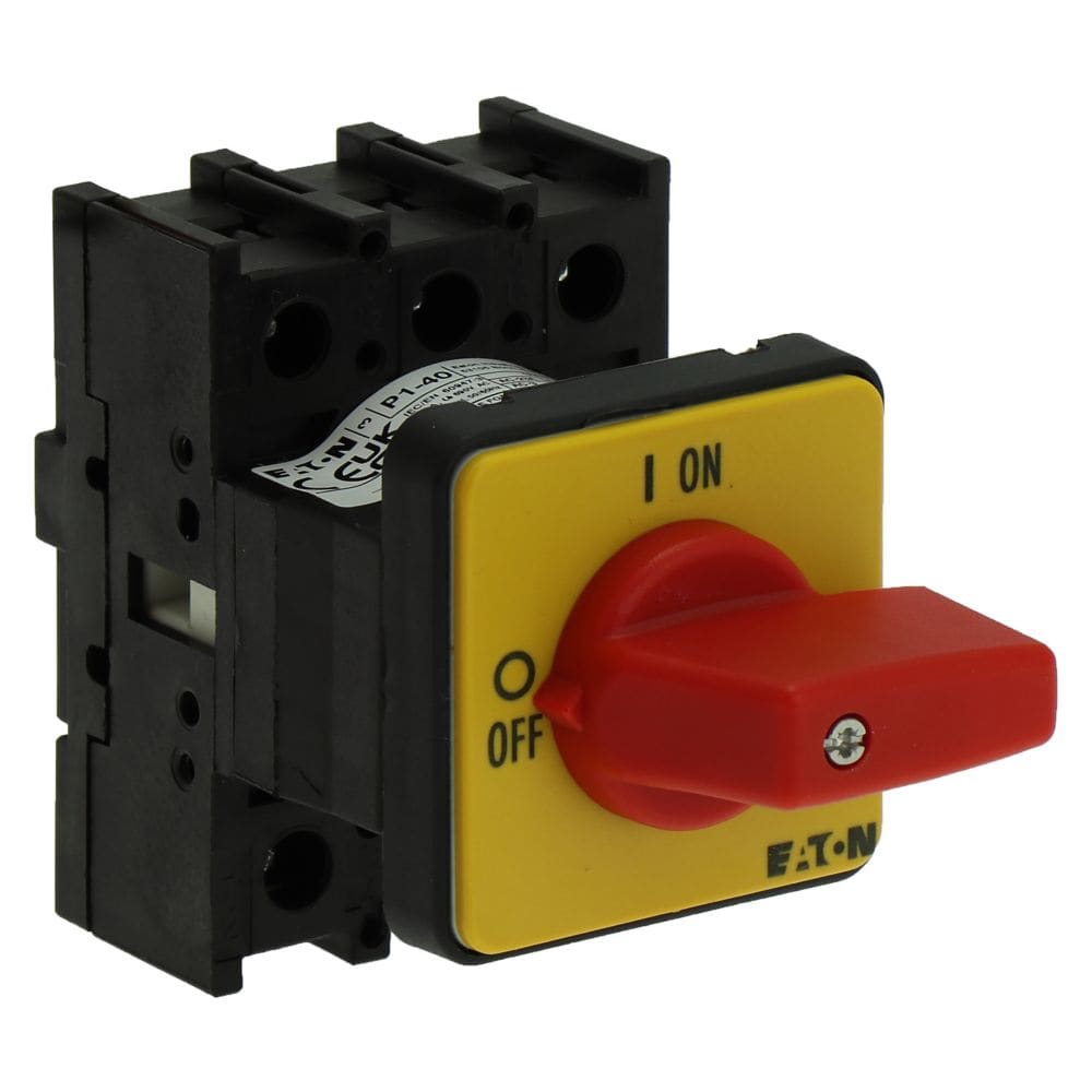 EATON INDUSTRIES - Interruttore ON/OFF P1 40A da incasso 3 poli funzione di arresto di emergenza maniglia rossa piastra frontale gialla SEZ. POT. 3X40A INCASSO.