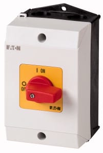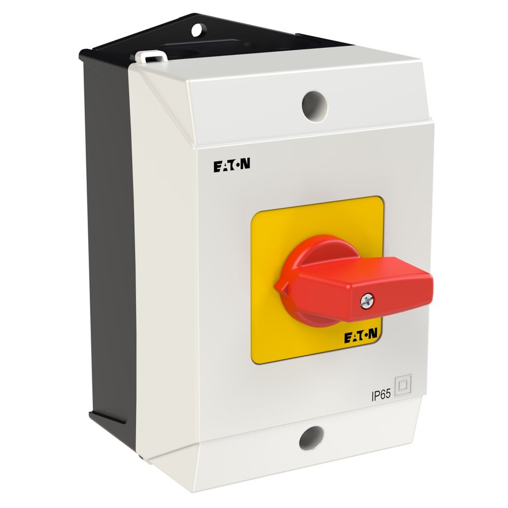 EATON INDUSTRIES - Interruttore ON/OFF T0, 20 A, in custodia, 2 unità costruttive, 3 poli, funzione di arresto d'emergenza con leva rossa e targhetta frontale gialla. 207082