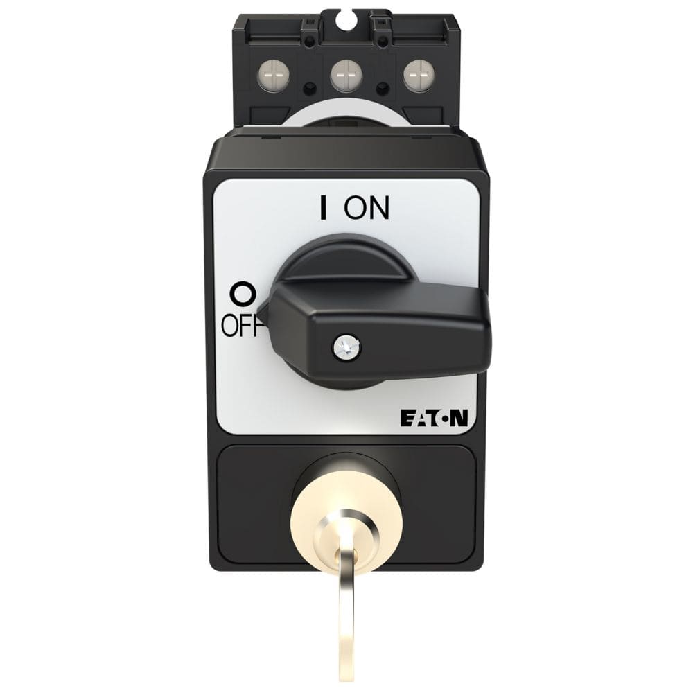 EATON INDUSTRIES - Interruttore P1-25/A, 25A, comando rinviato, 3 poli, leva nera, targhetta frontale, blocco con serratura cilindro SVA.