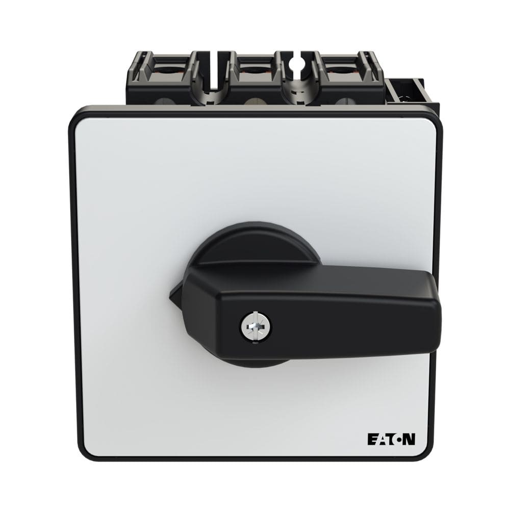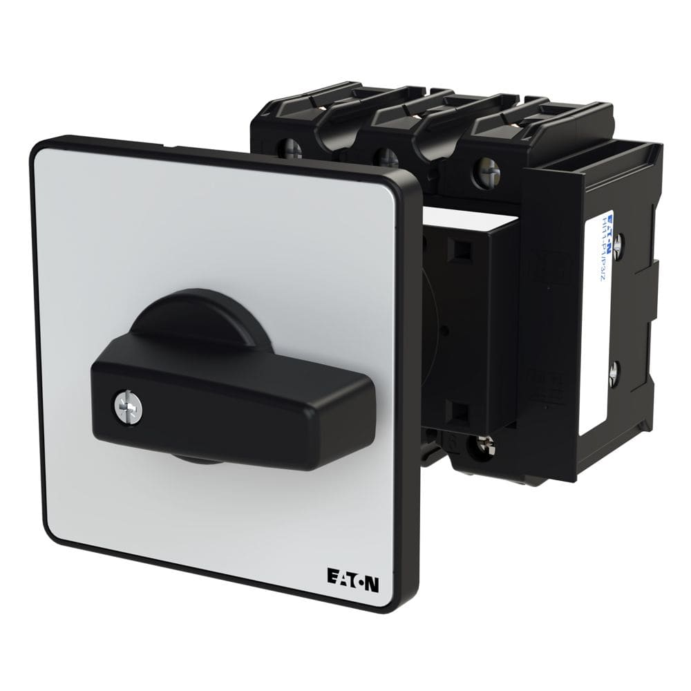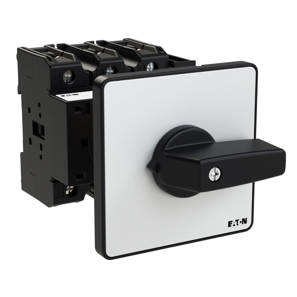 EATON INDUSTRIES - Interruttore P3 100A 3 poli con comando rinviato, 1NA, 1NC, leva nera e targhetta frontale.