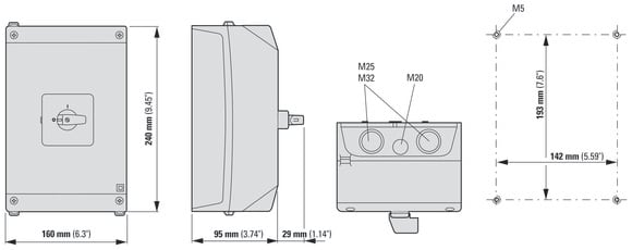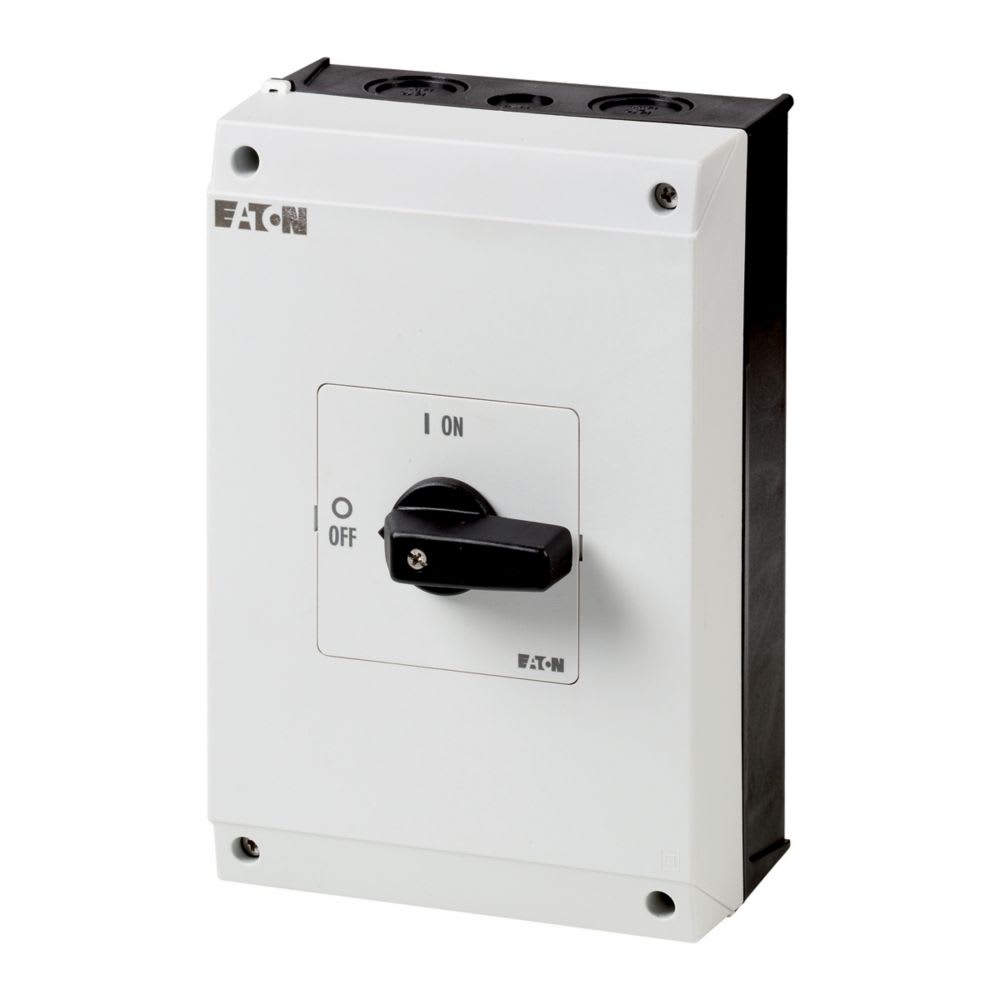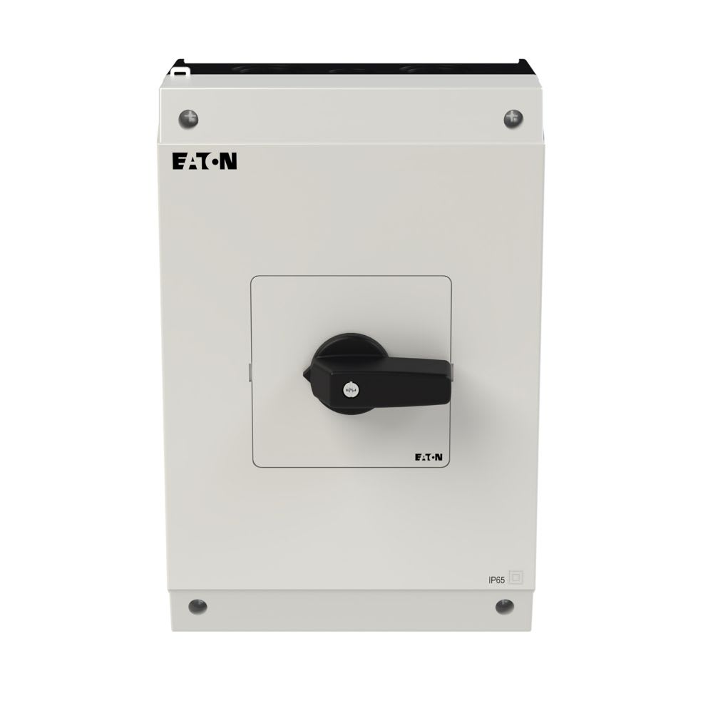 EATON INDUSTRIES - Interruttore P3 63A 1NA+1NC ON/OFF con custodia, 3 poli, leva nera e targhetta frontale.