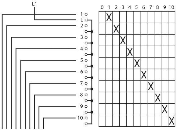 Interruttore a gradini, Gamma di prodotti: Commutatori di controllo, Conformità alle norme: IEC/EN 60947, VDE 0660, IEC/EN 60204, CSA, UL, Sezionatori di potenza secondo IEC/EN 60947-3, Rilevatore tipo: T0, con leva nera e piastra frontale, Contatti: 10, Grado di protezione: Frontale IP65, Design: da incasso a fissaggio centrale, Angolo di commutazione: 30 °, Prestazioni di commutazione: permanente, Con posizione 0 (Off), 5 unità di contatto, Corrente nominale ininterrotta: Iu= 20 A, piastra frontale: 0-10