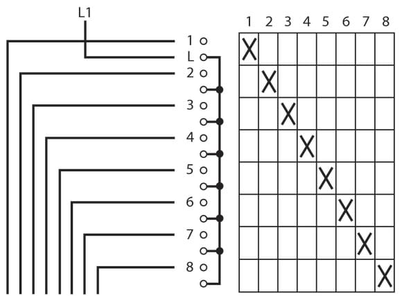 EATON INDUSTRIES - Interruttori a gradini, T0, 20 A, montaggio a incasso, 4 unità costruttive, contatti: 8, 45 gradi, permanente, senza posizione 0, 1-8, numero di progettazione T0-4-153/E.