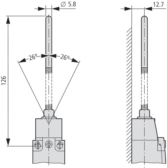 Testa motrice per interruttori di posizione LS-Titan, IEC EN 60947-5-1, alto grado di protezione IP66, apparecchio universale, sistema modulare, semplice tecnica di montaggio, le teste motrici possono essere posizionate in tutte e 4 le direzioni e applicate a scatto con innesto a baionetta, in modo semplice, rapido e sicuro. Non utilizzare l'azionamento ad asta flessibile per le funzioni di sicurezza, utilizzare soltanto in combinazione con un contatto a scatto