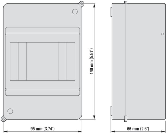 Quadro di distribuzione compatto mini di plastica, per l’installazione di dispositivi di commutazione e di protezione, in conformità agli standard sulle dimensioni DIN 43 880, con una profondità di installazione di 70 mm e una corrente fino a 63 A, 400 V /50 Hz, Grado di protezione IP20 fino a IEC/EN 62208, approvato per quadri di distribuzione di servizio in conformità alle norme IEC/EN 61439-3, per montaggio a vista, parte superiore con apertura dispositivo da 46 mm, sigillabile di serie, base e coperchio bianchi con chiusura a vite, pre-forato per ingressi cavi a passo metrico sulla parte superiore 1x M20, inferiore 1x M20, bilaterale 2x M20 e posteriore 2x M20, classe di isolamento II, 4 unità passo. Ordinare separatamente lo sportello finestra T4-MINI.