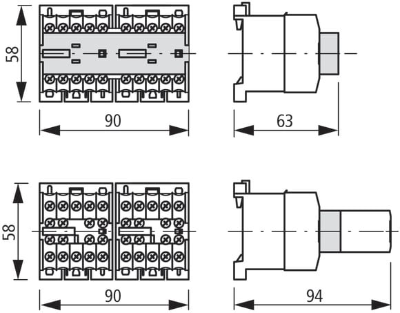 Interblocco, interblocco meccanico, Descrizione: Per contattori con sistema di azionamento uguale o diverso., Distanza fra contattori 0 mm., durata meccanica 2,5 x 106 manovre., moduli contatti ausiliari supplementari possibili., utilizzo con: DILE…