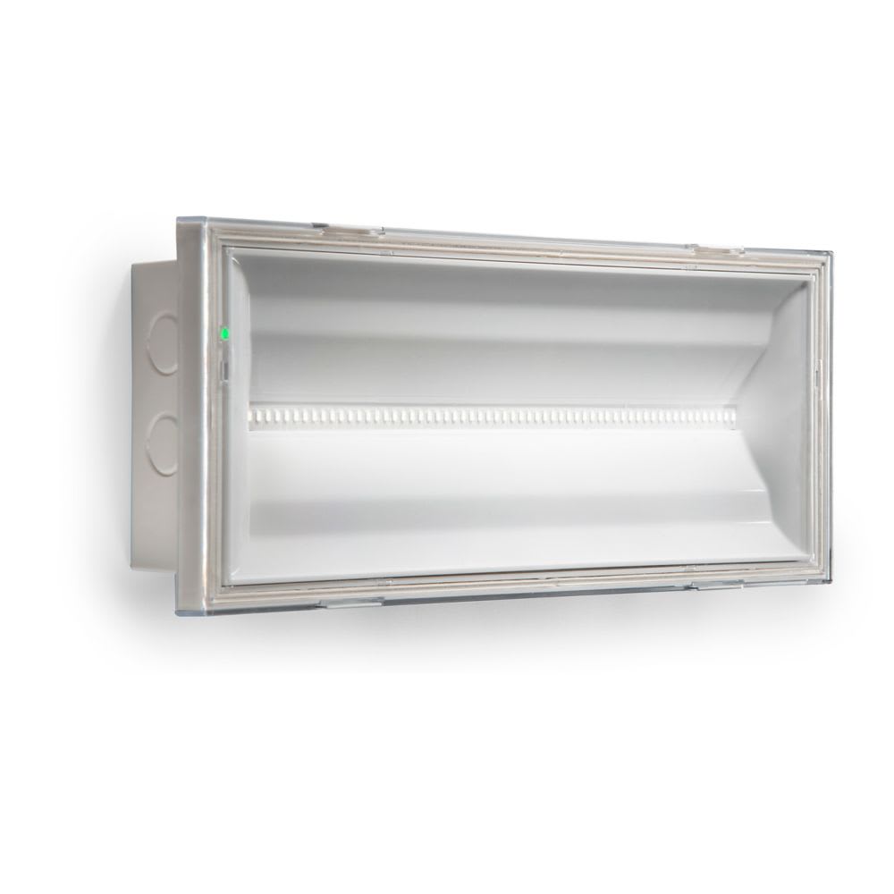 Apparecchio di illuminazione di emergenza a LED Eaton modello NexiLite, codice NXL1000-IP, con tecnologia Standard, lampada con flusso luminoso 1000/500lm ed autonomia 1/2h. Lampada di emergenza con ottica simmetrica avente grado di protezione IP65, resistenza agli urti IK07, modalità di funzionamento SA/SE, alimentazione 220/240V-50/60Hz, certificazione ENEC, batteria tipo Ni-Cd, dimensioni 290x110x40mm. L'apparecchio di emergenza può essere utilizzato per la segnalazione delle vie di esodo tramite kit opzionali monofacciali NEXI-PICTO o bifacciali NEXI-PLEX.
