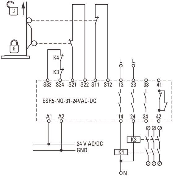 EATON INDUSTRIES - Relè sicurezza arresto emergenza/porta protezione, 24VAC/DC, 3 circuiti abilitazione ESR5-NO-31-24VAC-DC RELE SICUREZZA.