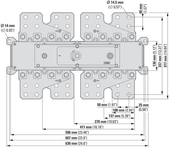 EATON INDUSTRIES - Sezionatore di potenza DMV 2500A 4 poli 2NA 2N/C con manopola rotativa grigia e albero di comando.
