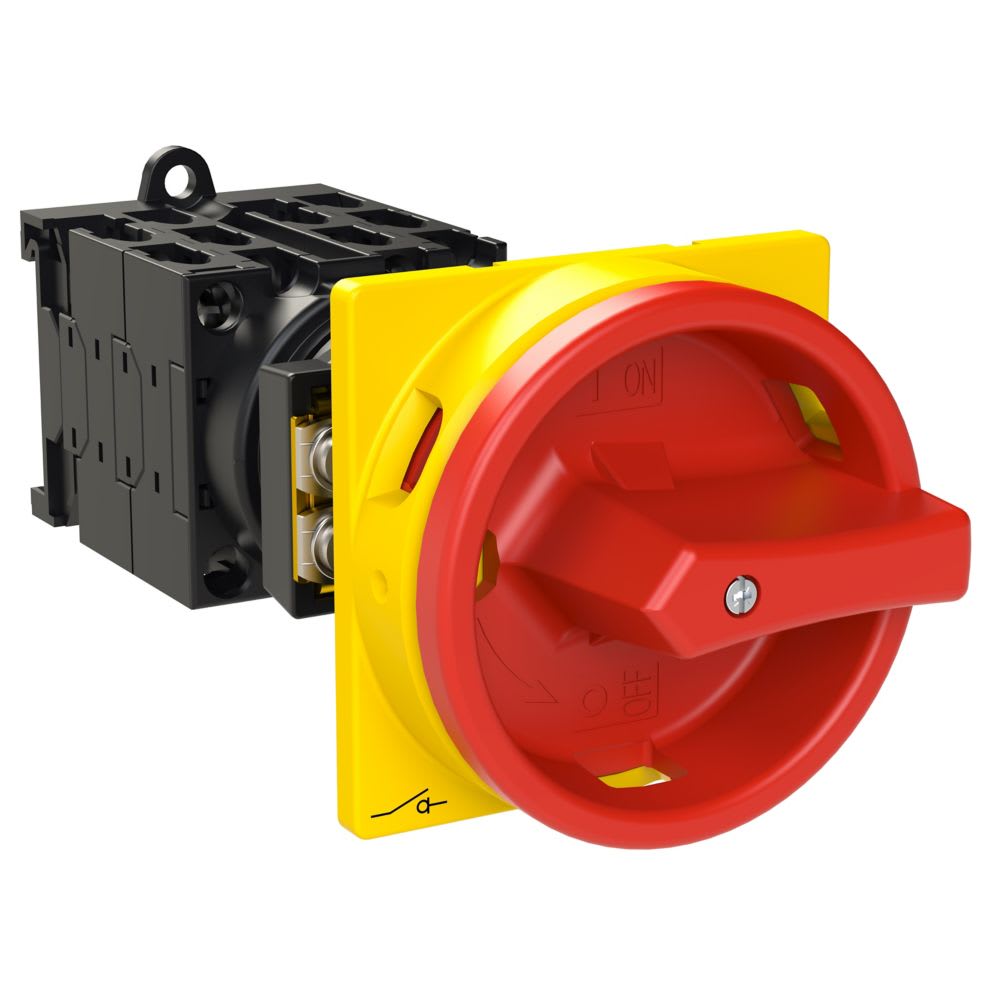 Interruttore generale, Gamma di prodotti: Interruttore principale, interruttore di manutenzione, Interruttore di riparazione, Riferimento gruppo parti: T0, Funzione di arresto: Funzione di arresto d'emergenza, con maniglia rotativa rossa e anello di blocco giallo, 6 polo, Impianto di blocco: Bloccabile in posizione 0 (Off), Grado di protezione: Frontale IP65, Design: fissaggio posteriore, Angolo di commutazione: 90 °, Potenza nominale d'impiego AC-23A, 50 - 60 Hz 400 V: P = 5,5 kW, Corrente nominale ininterrotta: Iu = 20 A, 4 Unità costruttiva/e, Conformità alle norme: IEC/EN 60947, VDE 0660, IEC/EN 60204, CSA, UL, Sezionatori di potenza secondo IEC/EN 60947-3