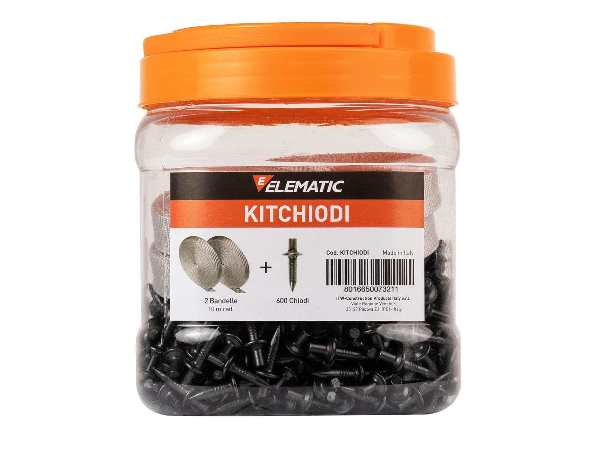 600 chiodi a percussione e 20 metri di bandella in tessuto. Contenuto del Kit: Kit chiodi + Bandella 2 rotoli - 18mm.
