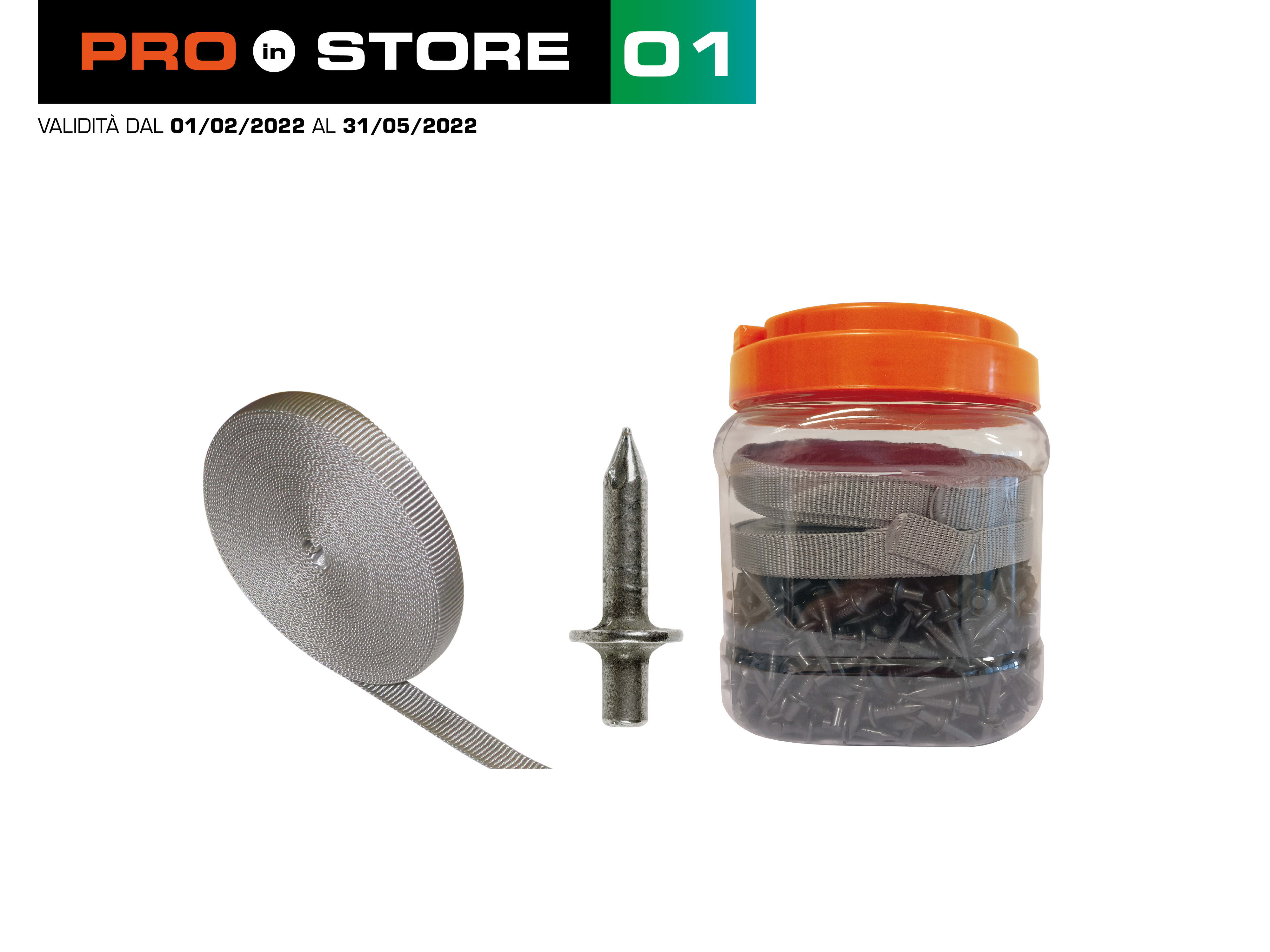 600 chiodi a percussione e 20 metri di bandella in tessuto. Contenuto del Kit: Kit chiodi + Bandella 2 rotoli - 18mm.
