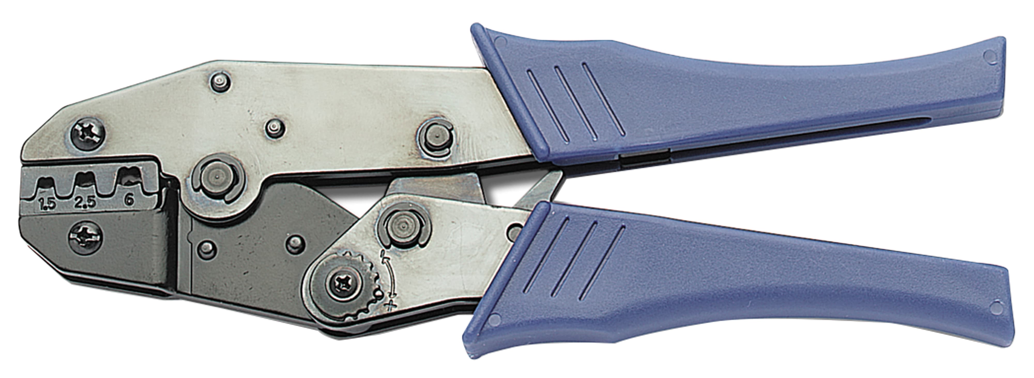 Utensile in lastra acciaio tranciata con matrici in microfusione. Per capicorda non isolati a colletto aperto da 0,5 a 6 mm². Dispositivo di regolazione serraggio ganasce. Sistema a cricchetto di chiusura dei manici e riapertura in automatico a crimpatura ultimata.