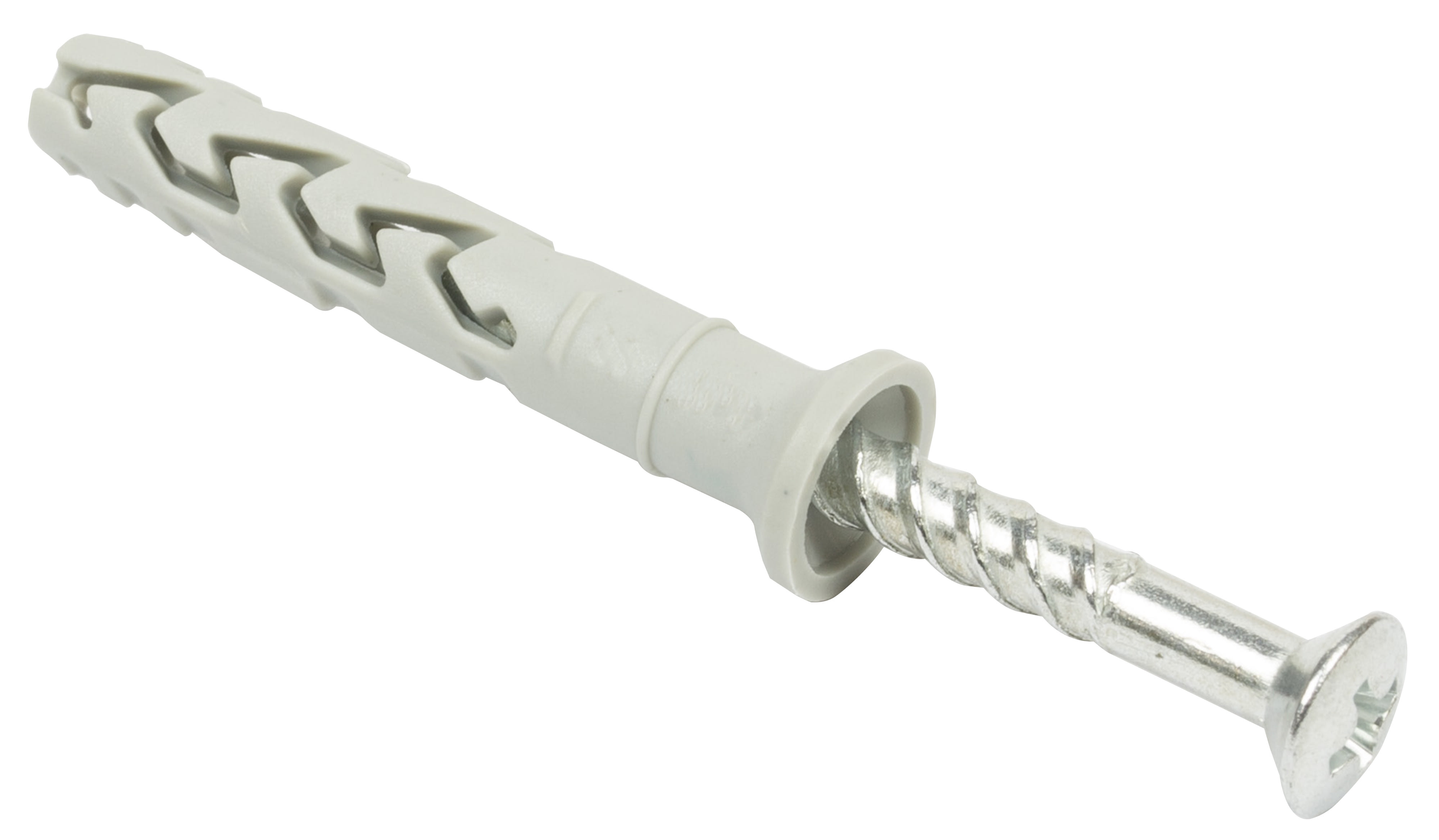 Ancorante leggero universale, in nylon, a percussione. Versione con testa svasata.. Fissaggio veloce con una semplice battuta. Espansione velocissima su due direzioni con apertura asimmetrica di segmenti laterali su altre due direzioni. Si adatta alla struttura dei diversi materiali edili più efficacemente rispetto ai tradizionali tasselli a battuta. Riduzione della profondità di foratura per ridurre tempo e costi nelle fasi di installazione. Geometria del corpo e dimensioni delle teste assicurano un efficace bloccaggio dell'oggetto da fissare e una perfetta finitura. Nessuna pre-espansione del tassello prima del completo inserimento nel foro e nessun fuori asse della vite. Resistente e sicuro anche nella posa a basse temperature. Guide e supporti per cartongesso;. Strutture e profili metallici per pareti a secco;. Profili e supporti in legno per rivestimenti e isolamenti interni;. Canaline e collarini;. Clip per tubazioni elettriche;. Reggette metalliche per fissaggio tubi corrugati..