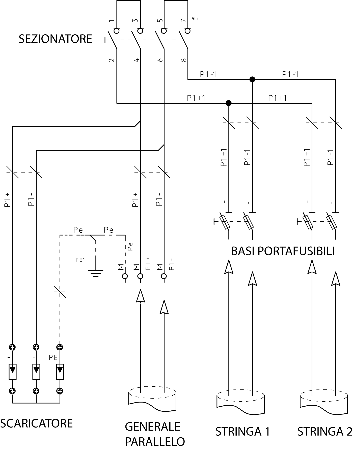 Quadro cablato di protezione stringhe per impianto fotovoltaico. 2 stringhe in parallelo fino a 1000Vdc con protezione fusibile GPV 16A in ingresso, 2 basi portafusibili 10,3x38 1000Vdc, scaricatore di sovratensione tipo 2 a 3 cartucce 1000Vdc Isn 20kA, interruttore non automatico-sezionatore 2x40A, contenitore in ABS con porta trasparente 18 moduli IP65