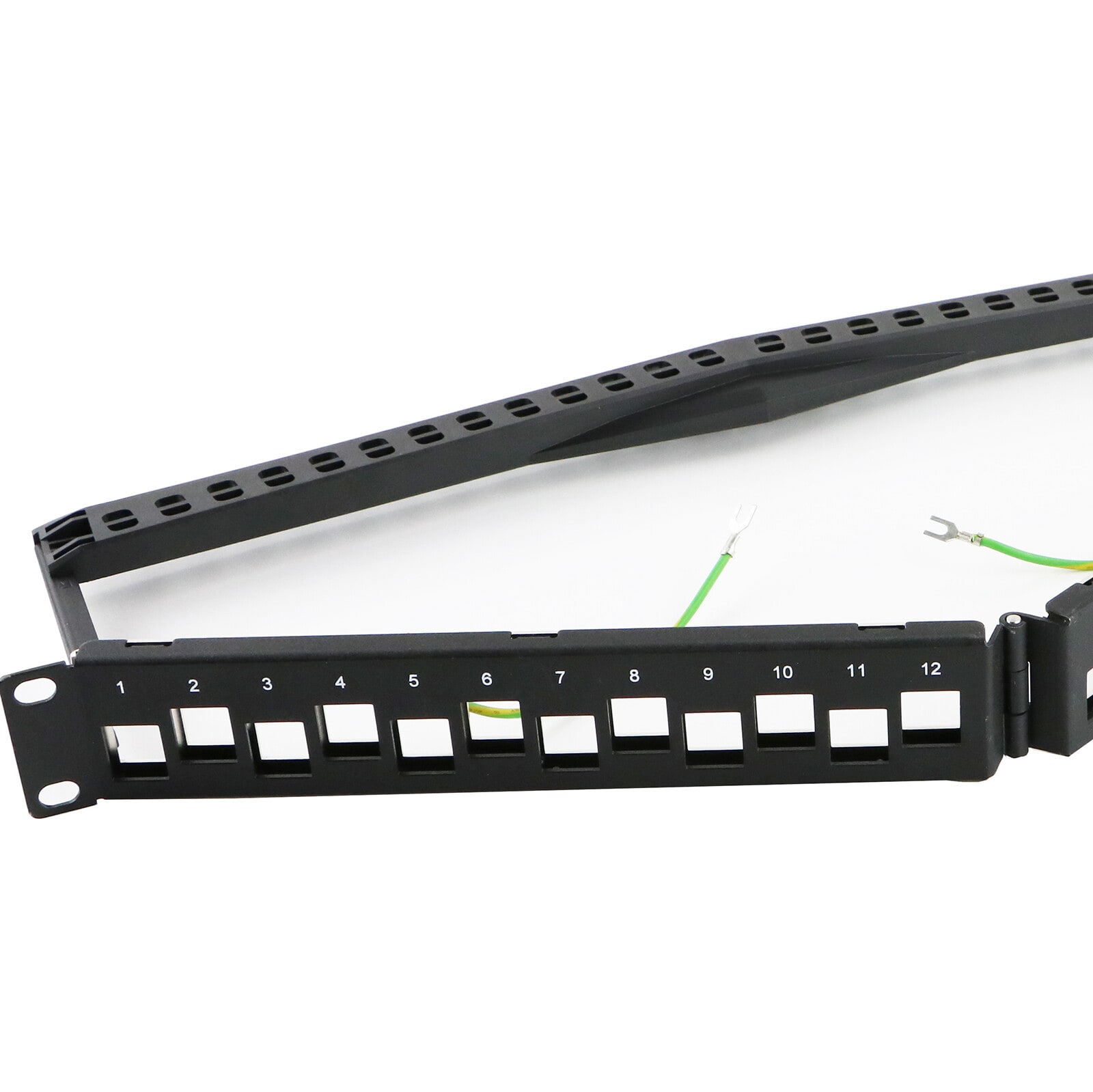 Questo pannello include un gestore di cavi posteriore per consentire l'inserimento ordinato e sicuro del cavo nel pannello. La forma a "V" del pannello presenta i connettori ad un angolo rispetto alla parte anteriore dell'armadio, riducendo così la tensione sul connettore che deriva dal cavo di patch. Il cavo di patch viene instradato naturalmente verso la gestione dei cavi dell'armadio/telaio, riducendo così la necessità di barre di gestione dei cavi montate su rack.